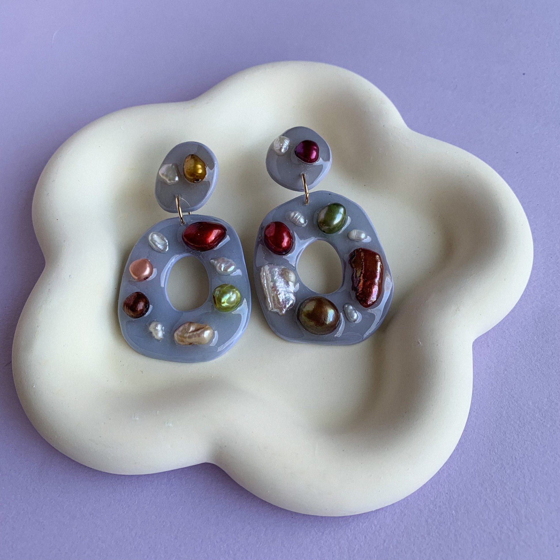 Organic circle dangles, coated in resin and covered in mixed color fresh water pearls